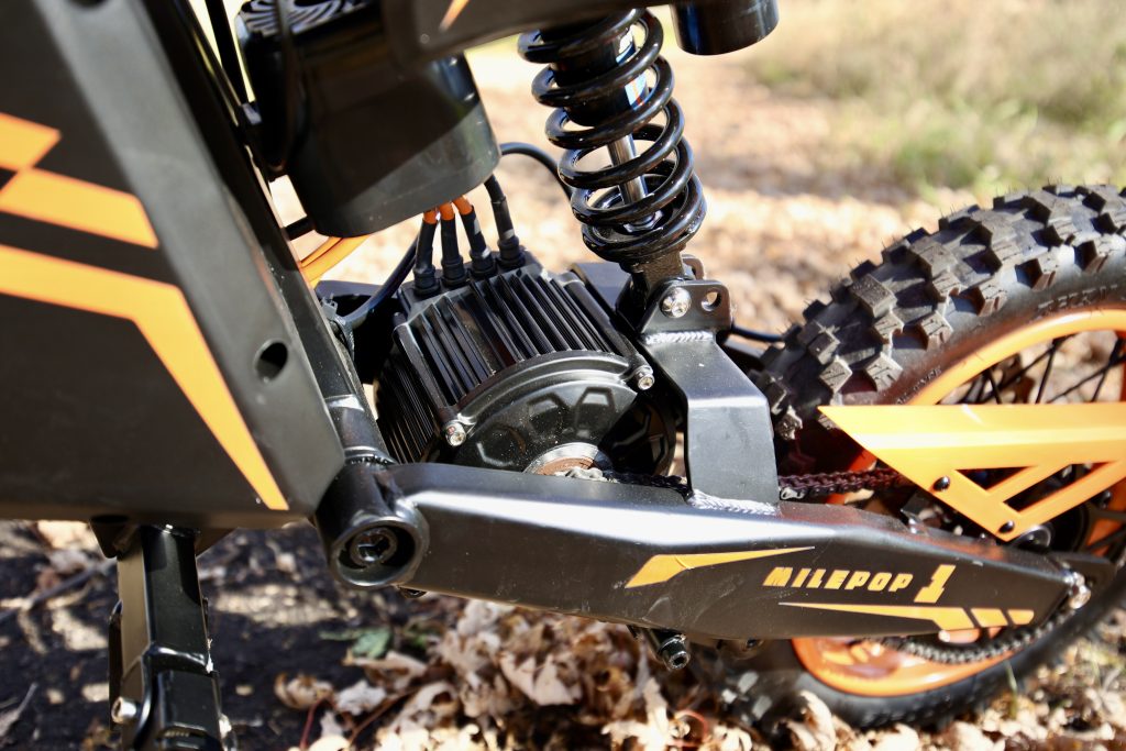 This isn’t a hub-motor toy. The MilePop01 runs a 3,000W mid-drive that drives the rear wheel by chain, so torque hits early and clean. Top speed lands around 31–32 mph stock (it feels like there’s more in reserve, but the controller might keep it capped). The dash even shows amp draw, and I briefly saw ~70A peaks during hard acceleration—no wonder it pops off the line.