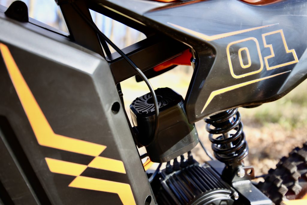 Under the fairings, though, it’s a real machine: 3,000W mid-drive, legit dirt-bike suspension, strong hydraulic brakes, and a compact 14″/12″ wheel setup that keeps the seat low and the bike super tossable for kids and smaller riders. It’s like a pocket-sized scrambler with a boombox for a heart.